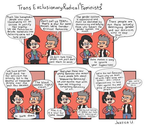 Don’t just toss out a “fuck terfs” every once in a while and think your job is done. If you actually want to be an ally to trans women, BE AN ALLY TO TRANS WOMEN. Make your spaces a safer place for us, and be VOCAL about it. Be consistent, persistent, and insistent on defining us authentically as women and make it obvious that we’re accepted and welcomed as such. And make sure you are boosting the voices of trans women in queer and women’s spaces if there’s any doubt that you don’t have the best information to hand out on trans issues, because misinformation about us is the best weapon terfs have. START DENYING THEM THAT WEAPON BY ACTIVELY PRESENTING A TRUTHFUL NARRATIVE ABOUT TRANS PEOPLE INSTEAD.